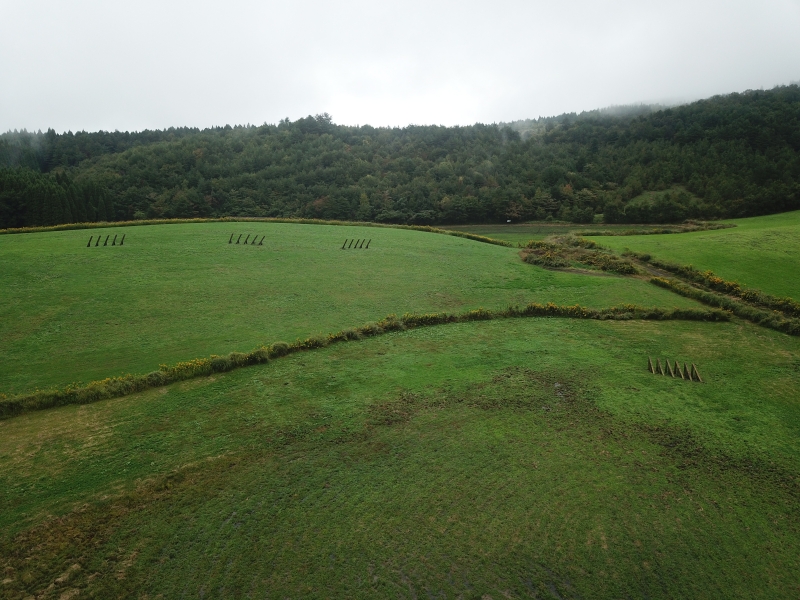 今回は10月13日に国の重要文化的景観に選定された大字上田の流湿原をその表現の舞台とし、小国杉を材料とした制作物と流湿原とのインスタレーションを表現していただきました。