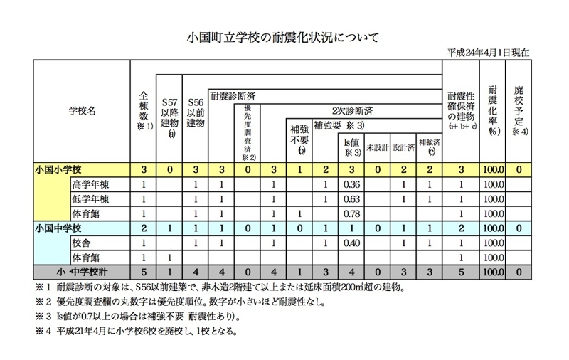 小国町立学校の耐震化状況 小国町立学校の耐震化状況が数値にて確認できます。 小国町立学校の耐震化状況について ダウンロードファイル 耐震化状況 (PDF 43KB) この記事に関するお問い合わせ お問合せ先小国町役場 教育委員会事務局 学校教育係 電話番号:0967-46-3317 追加情報:PDFファイル PDFファイルをご覧いただくには「Adobe Acrobat Reader」が必要です。お持ちでない方は、バナーのリンク先からソフトウェアをダウンロードしてください。(無料)