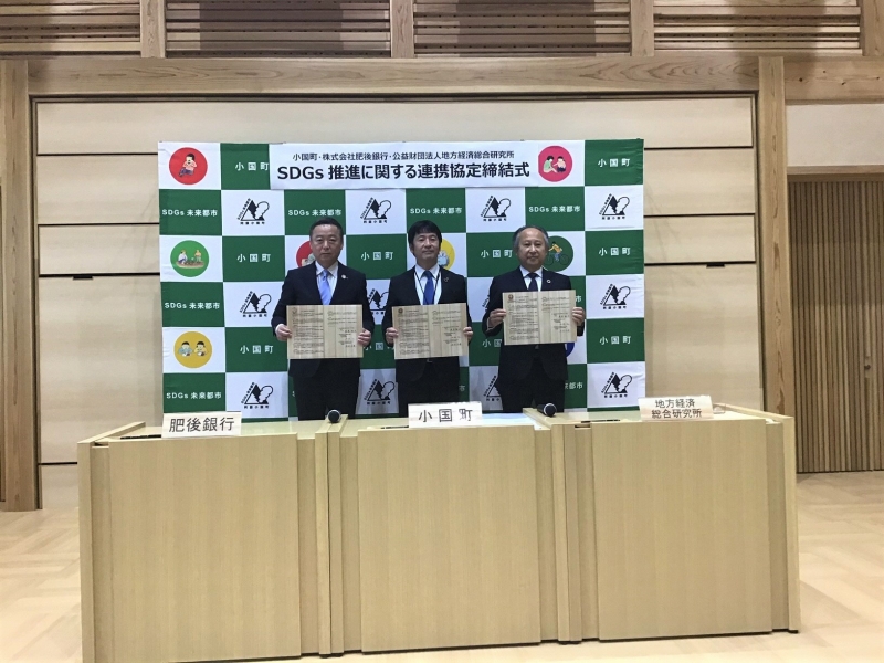 令和2年5月21日、小国町は株式会社肥後銀行・公益財団法人地方経済総合研究所と「SDGsに関する連携協定」を締結しました。今回の連携協定はそれぞれの資源や機能などの活用を図りながら、幅広い分野で緊密な相互連携と協働を行い、地域の課題やニーズに迅速かつ適切に対応することで、SDGsの理念である持続可能な地域社会の実現並びに地域循環共生圏の構築に寄与することが目的です。